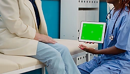 在医院接待大厅 一名亚洲护士和一名病人正在看一台有绿屏的笔记本电脑 隔离的复制空间模板与空白色度键和实物模型背景在等待区