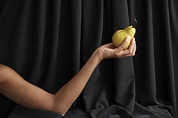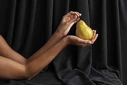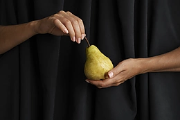 从远处俯瞰桌布上的梨令人垂涎欲滴桌子中央紫色桌布上的三个梨