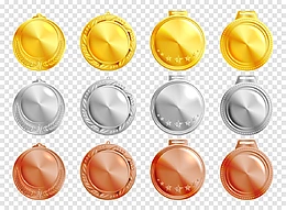 透明背景上的十二个圆形金银青铜现实主义奖章模型独立矢量插图