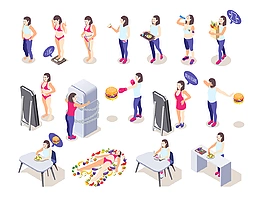 女性在饮食等距构图与女性角色拥抱冰箱覆盖链矢量插图